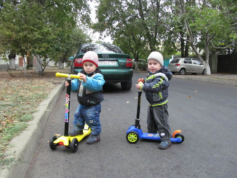 мои красавцы..осваивают новый вид трансорта - самокаты