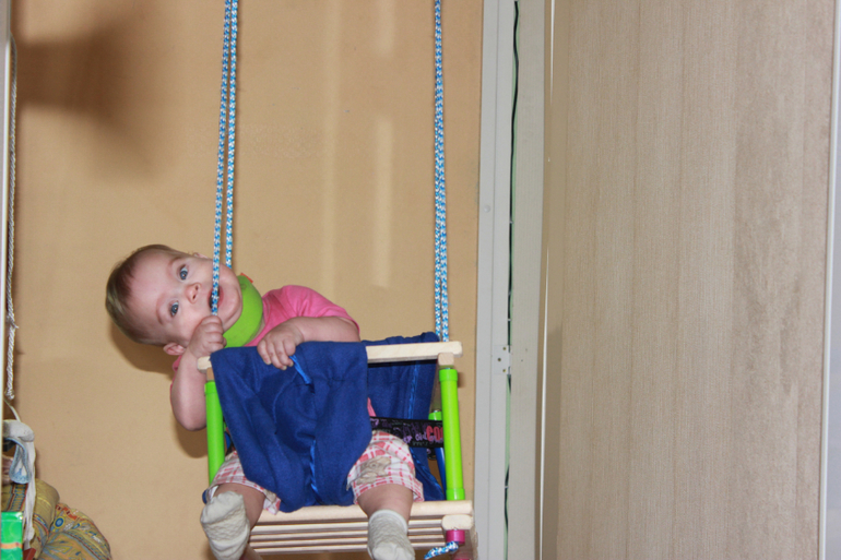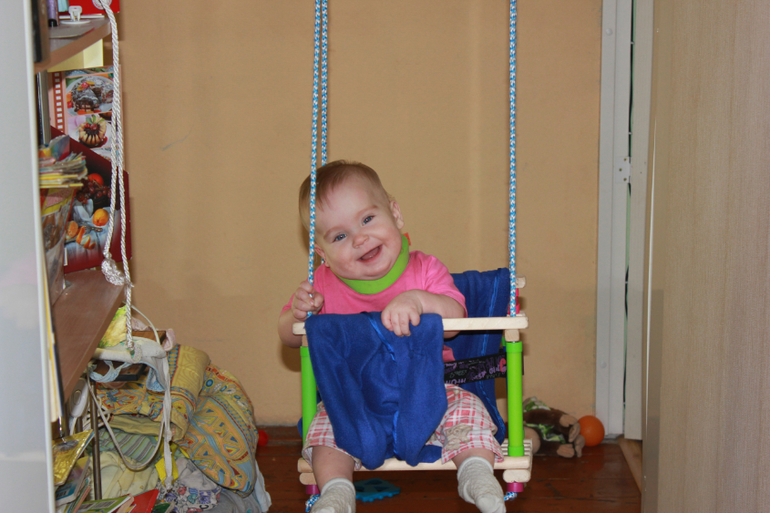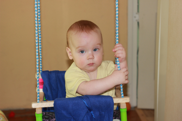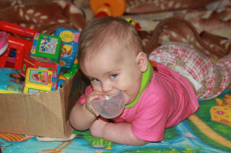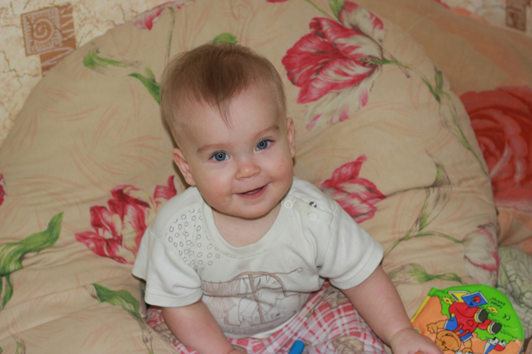 Алиса стала вставать у опоры и делает пару шагов у опоры. За обе ручки ходит по комнате, но как бы пританцовывая. Тоже играет в ладушки, говорит "мама, папа, баба, не," ползает все так же, по-пластунски,играет в мячик (бросает его, если просишь). У Алисы - 8 зубов.
