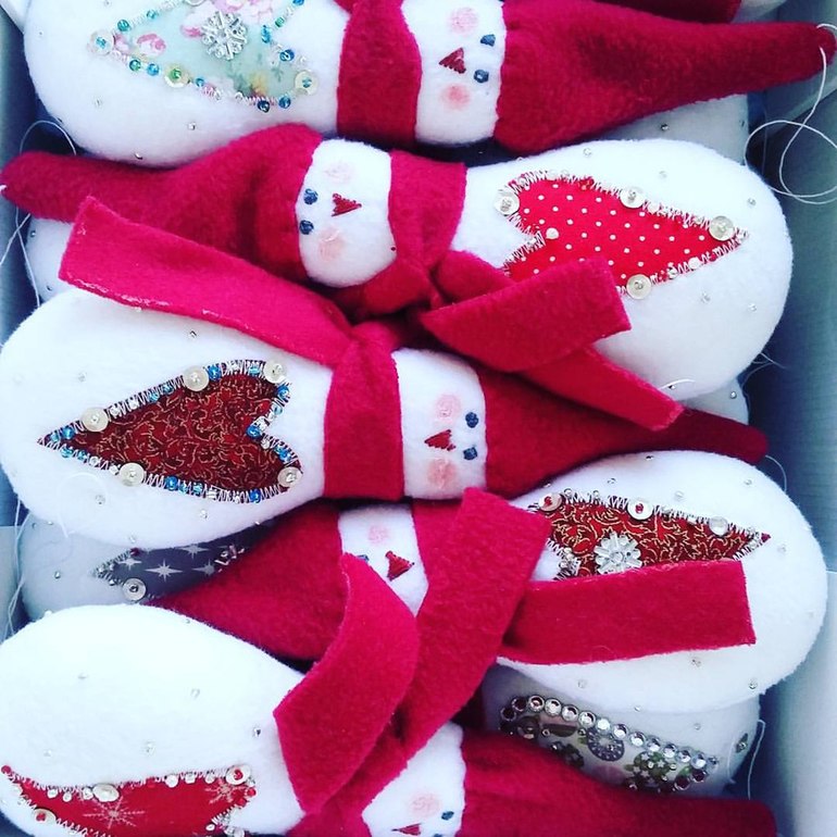 Снеговички....я хотела сшить игрушки попроще..а потом попробовала украсить бисером и пошло поехало))