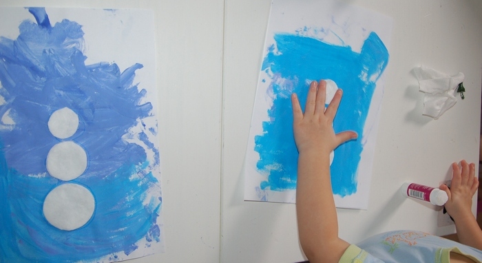 Прилагаю наш отчет: мы сначала нарисовали синюю основу, потом прикрепляли ватные диски. Точечки ставили маркерами.