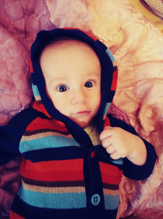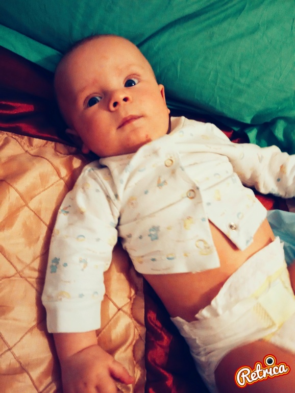 Витюшка - мамин сына. Ленивый до ужаса, переворачивается через раз. Спокойный, улыбчивый, прям мур-мур. Тянет ручки к игрушкам, держит бутылочку, вставляет себе соску. Любит, когда целуют попку, качают на животике, когда мама строит дурацкие рожицы, читает сказки и при этом озвучивает животных. Особенно любим "пи-пи-пи" (мышка), "мяу" и "мууу". "Мууу" любит повторять сам. Очень обижается, когда Паше первому достаётся бутылочка, прям смотрит и требует тоже. Любит покушать, выпивает всё до капельки. Прикорм ест, но особого энтузиазма нет. Иногда кривится, типа что за гадость мне дали. Стал реагировать на чужих людей. Вообще у нас постоянно кто-то есть, каждые выходные кто-то в гости приезжает, и удивительно, что он стал боятся людей. Может, конечно, они ему просто надоели)))) особенно не любим свекровь. Уж не знаю, почему! В течение двух недель она приходила каждый вечер, и мы были каждый день в слезах. Точнее мы всем улыбаемся, пока нас не тронут. А дальше слёзы. Любит поспать, из-за Паши постоянно приходится будить. Любим музыкальные книжки, огонечки. Решили с мужем, что он у нас будет артистом)) лечим аллергию, вроде стало лучше. Вите! А маме с этой диетой, где есть одно слово НЕЛЬЗЯ, уже скоро можно будет вешаться)))) зато вернула свои 54 кг) остался один лишний, но я думаю, он в груди )
