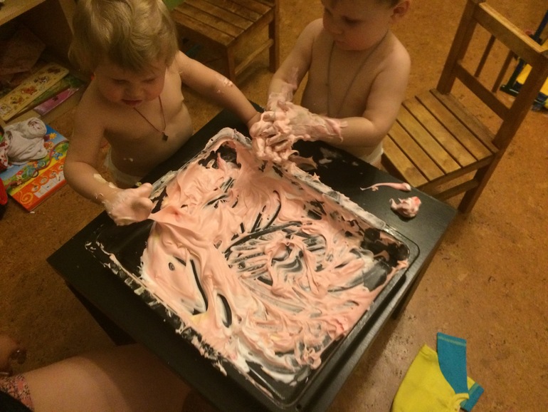 На вечер оставила "грязную" игру. Выдавила пену и накапала краску. Дети пошли сразу в бой! Но как только пена прилипла к рукам Надя начала их отряхивать