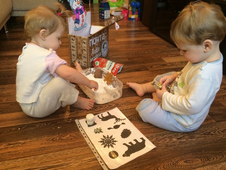 Сделала им теневое лото, думала не пойдет. Получилось 50/50. Надя выложила сразу все предметы только как увидела листочек с рисунками. Илья не проникся совсем, но парочку все таки положил. Ему больше в клад понравилось играть и зверей спать укладывать.