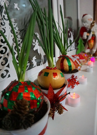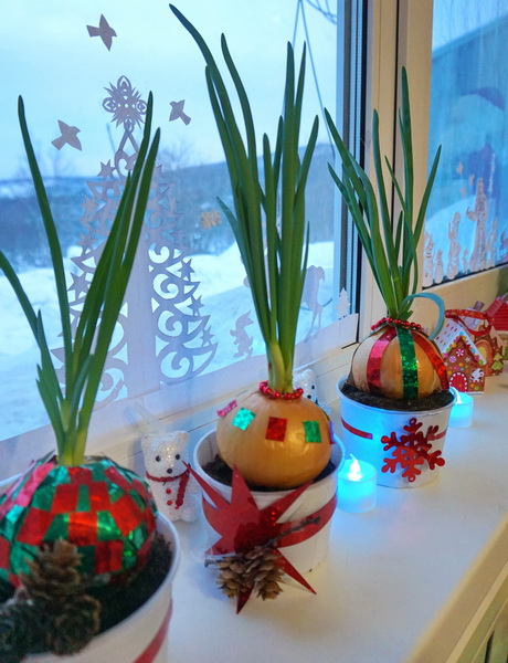 А вот наш новогодний лук из самоклейки! Дети спорили из-за каждого кусочка, лишь бы дали наклеить ей, а не сестре.Так что хэндмейдили по очереди---один Юля, один -- Настя.