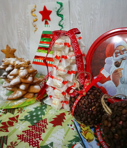 Весь вечер домик был в центре внимания: в нём поселились гномы и разные зверушки, которые периодически устраивали пикники на крыше и под ёлкой, потом прилетали страшные драконы, пытавшиеся охватить пламенем и сжечь всех его жителей, за которых тут же вступались бесстрашные бдительные рыцари..Всех их кормила и отвечала за чистоту Белоснежка. В первый же вечер из домика было похищено много сокровищ( конфет ммдэмс и зефирных тянучек) и каждый последующий вечер его " подгрызали мышки".
