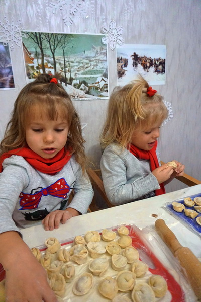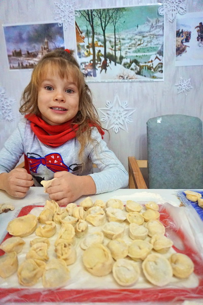 В этом году дети впервые лепили пельмени.Для первого раза получилось отлично- я только успевала раскатывать.Каждая налепила по пол доски: Настя их от души заворачивала, а у Юли получились большие края( лопухи).Потом они с удовольствием уплетали свои смешные пельмени, даже папе досталось.