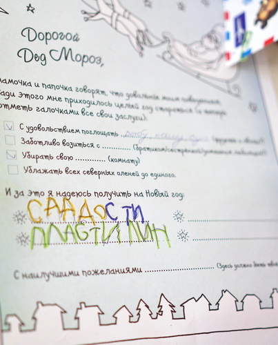 Писали письмо Деду Морозу.Сначала Юля писала, а Настя делала марку, затем поменялись.