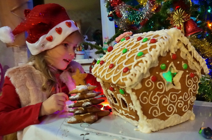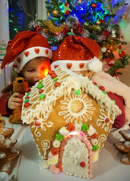 Ну, и главная интрига всего поста- имбирный пряничный домик! Пекла в первый раз, на свой страх и риск. Не всё получилось так, как я хотела, учту ошибки в следующий раз.