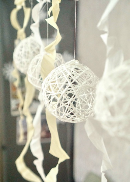 Шары- паутинки смотрятся эффектно, а делаются очень просто: 1 ст. лож. воды+ 7 ч лож сахара + 50 мл клея ПВА .Нужно погрузить небольшой моток пряжи в указанную смесь (я делала в 4-ёх кратном объёме) и оставить на 30 минут минимум.Пока нитки пропитываются, надуть воздушные шарики нужного размера, главное- чтобы они оставались круглыми (форма шишки и пр. не годятся). Идеальный размер- от10- до 20 см..Смазать шары растительным маслом или кремом, чтобы в последствии нитки не прилипли и легко отделились от шарика. Затем обмотать смазанные шарики нитками и подвесить сушиться на 2-3 дня. Когда нитки просохнут, надо проколоть шарик и вынуть через отверстие..