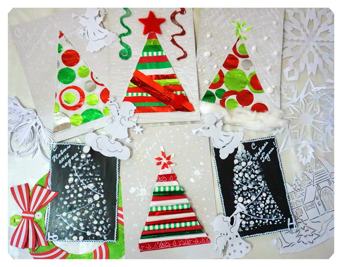 Конечно,без новогодних открыток не обошлось. Круги из фольги детям трудно было аккуратно вырезать, поэтому я сложила бумагу стопкой и в несколько приёмов вырезала сразу много штук, а они наклеивали. Вытанки остались с прошлого года - я их просто прогладила утюгом и повесила.