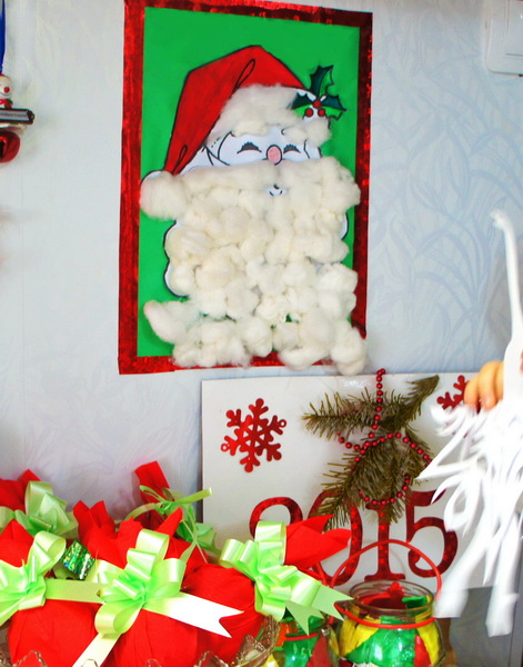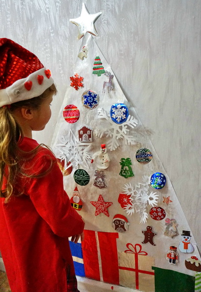 а в этот раз наш адвент календарь был более трудоёмким и интересным.. Я наклеила из самоклеящихся листов ёлку,а дети прошлись по ней круглой щёткой, смоченной в серебряную гуашь. Начиная с 1 декабря, мы каждый день делали игрушку и утром клеили её на соответствующий номер, который надо было ещё найти, ведь они были раскиданы по ёлке в хаотичном порядке. А с 15-го декабря дети находили в полосатых пакетиках по подарку. Крупные подарки, не вмещавшиеся в пакеты, лежали возле ёлки. Это были наклейки, разные материалы для творчества, настольные игры с кубиком, маленькие сладости, подарки новогодней тематики, любимый детьми песок, теперь уже цветной космический, и части игры El Bazar.