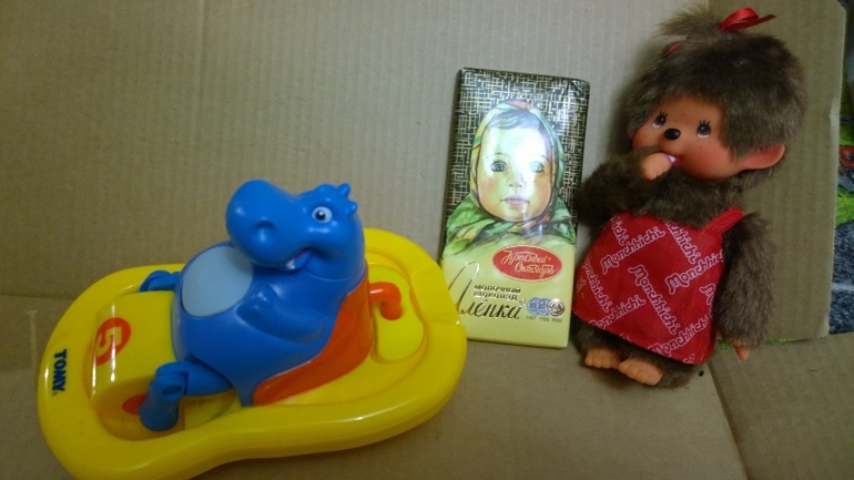 Очень вкусные конфетки - все уже попробовали, замечательные игрушки для детей - в ванной нашей бегемот уже поплавал, обезьянка вообще красотка - такая приятная :) А книжки для занятий - самое нужное для мамы :) Спасибо за подарочки для мамы - гель для душа и шоколадочки и всякие новогодние прелести :)