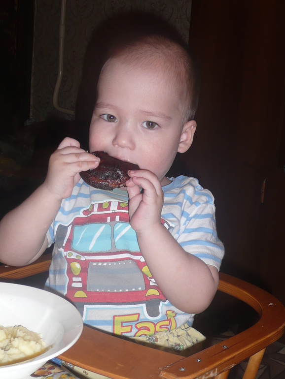 Кушают ВСЁ!!! Захар первое время отказывался от запеканки в саду, но последние пару раз съедал всё, без остатка. Мясо из супа могут помусолить и выплюнуть. Егор любит сыр. Оба обожают колбасу)), блины, бананы. В общем с аппетитом проблем нет!