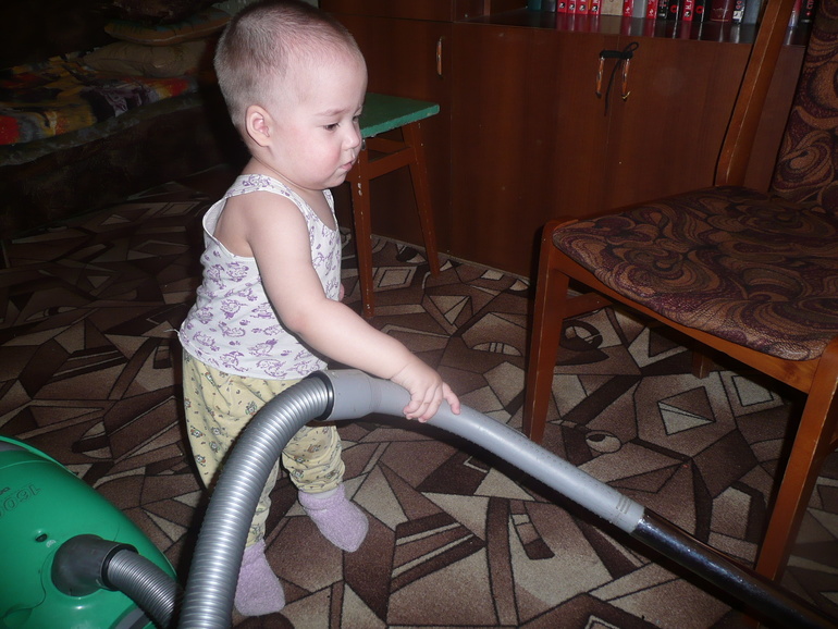 А это он пылесосит. Знает как достать шнур, как воткнуть вилку в розетку, включает пылесос и деловито начинает убираться)))