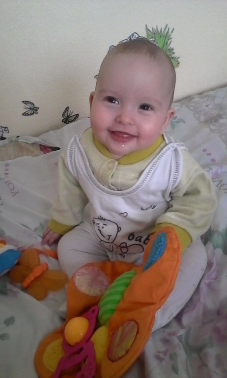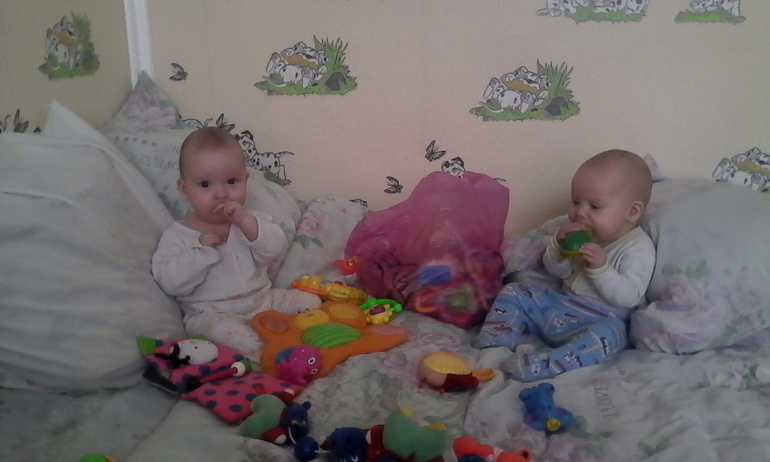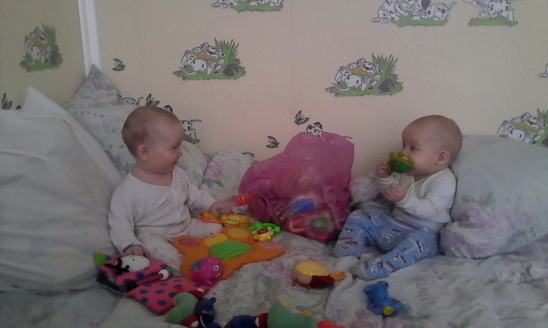 Ну вот и нам исполнилось 7 месяцев!!! Дочурочни мои растут не по дням а по часам)))) каждый день что-то новенькое осваивают. С ними стало гораздо легче, уже друг с другом калякаютНаконец-то сели обе (Сначала Машулька села, а через 2 недельки и Дашулька) оставлять их одних уже опасно крутятся на все 180 градусов, недавно Машу уже на лету поймала, аж пятки взмокли как я к ней летела! Хотя за 2 мин. до этого лежала по середине дивана. Так что теперь мои "рачки" засидают в манеже)))) от греха подальше! Машулька стала такой балтушкой, говорит а точнее издает звуки: ма, па, ба, мапаба! Дашулька да, отда, ата ну и больше мычит)))) Улыбаются друг другу, забирают игрушки!!! Даша любит обниматься, я аж балдею когда она своими пухленькими ручками обнимает мое лицо и наклоняется к нему
