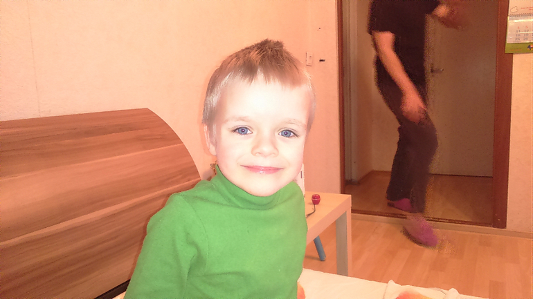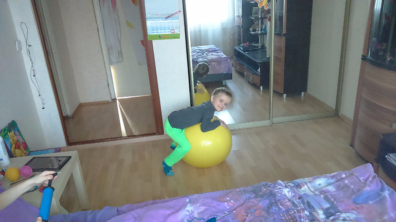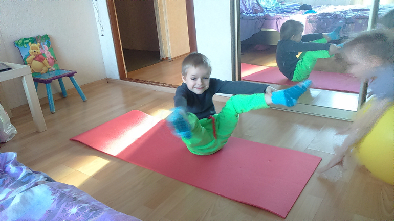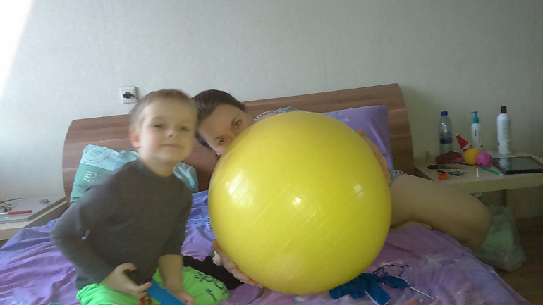 Сегодня нашла коврик, мы и поотжимались, и пресс покачали, и ногами подрыгали. А потом нашли мячик, я как раз себе легкие разработала. И вот мы на этом мячики по очереди потренировались, но так как уже подустали, в основном на мяче баловались. Как теперь себя заставить по утрам зарядку делать :((((