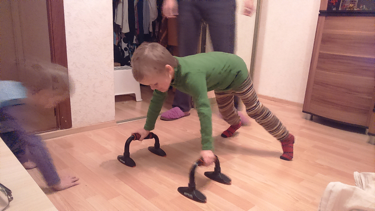Было и отжимание, Пуня нормально так отжимается, Мася же либо попой, либо на пол падает и вообще поднять себя не может. Было принято решение, тренировать их хотя дома.