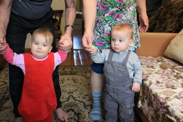 Двойняшки от 1 года до 3-хДавно ничего не писала... В год сходили с детками на приём: Тима весит 10,750 рост 77 см, Алиса 10,040кг и 75,5см. Специалистов почти всех прошли, остался психиатр и стоматолог у Тима, было холодно, я не пошла никуда с ним, успеется ещё. А Алисе невролог дал направление в Айболит на массаж и физио, т.к. спинка слабая. 9-го на приём туда поедем. Говорят мама, папа, баба, деда/дядя, дай-дай, отдай, Мау ( мяу), бааба( это у нас барарабан), ням, айяй, а так в основном мычат и пальцем тычут))) пирамидку собираем, стаканчиками играем, куклу кормим с ложки и спать укладываем, машинки любим. Тима бегает уже бегом, а Алиса сама не ходит, может за ручки ходить, но предпочитает на четвереньках. Получается быстрее, чем у брата))) Все тащим в рот...Вот все что найдём и сможем стащить (не еду). Начали кушать рыбку. Вроде хорошо пошло. Книжки любят смотреть, слушают сказки, но книжки только картонные, тонкие сразу рвут и в рот. Любят танцевать под любую музыку. Особенно любят танцевать с маминым планшетом))) Научились включать его, теперь прячу, т.к.чуть что сразу истерят... Стали драться между собой, прям беда.