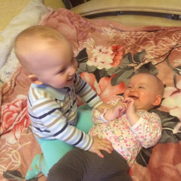 Спасибо! Мы когда играем, играем с обоими. Если в мяч, то Толя Полине бросает, если они играют в прятки, то оба прячутся и выглядывают из-за угла, выглядывают, увидят друг друга и смеются, выползают на встречу друг другу, посмеялись, и пошли дальше прятаться. Очень забавно смотреть на них в этот момент.