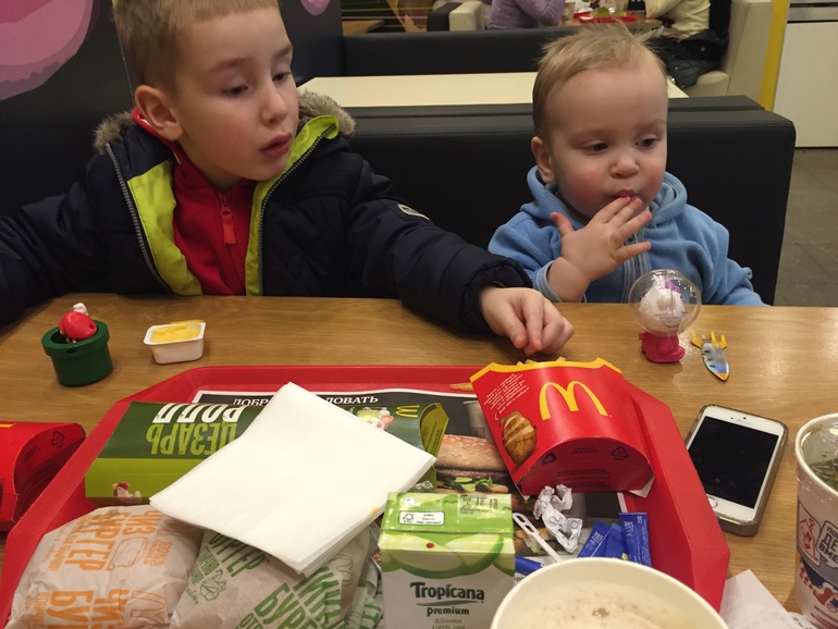 Ну я даю по паре картошен и хлеб от булки или котлету) мы там редко бываем) в основном я их не беру по кафешкам) но если уж беру, то и есть разрешаю))