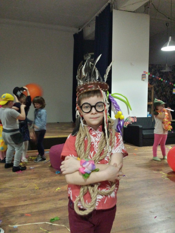 Конечно купила гавайские украшения,браслеты и бусы.А себе юбку.Сам день рождения проходил в чудесном месте ,называется Анти кафе.Самое главное там была настоящая сцена.Но не было кухни в глобальном плане где готовят еду.Кухня была,но там можно было разогреть и сделать чай и кофе.Поэтому готовила сама .С едой сильно не заморачивалась.Моя задача была чтобы все дети поели.Поэтому сделала вкусную пюрешку из картошки и вкусные ,нежные сосиски.Конечно овощи и чуть чуть нарезки мясной.Конечно бутики с икрой и самое главное любимое блюдо детей суши)))