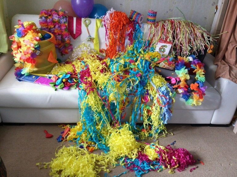 Украшала кафе сама.Заказала шарики с гелием.Сделала (уж как получилось))))шедевральную пальму)))из шариков.Гавайская растяжка с фонариками.Самые главные сюрпризы для детей были большие шары и импровизированный гавайский салют(которые они не сразу увидели ).Я думаю многие знают про бумажное шоу.Я очень хотела заказать детям эту услугу.Но оказалась как то неожиданно дорого и это дорого всего лишь на 20 минут.Поэтому напрягла мозговые клетки и придумала вариант не хуже.Купила гофрированную бумагу,цветную.И не разворачивая рулончики нарезала ,старалась по тоньше.Девчееенки,сделайте,не пожалеете.Реакция детей была супер.Конечно эта бумага так легко не летала,но малые бесились и таскали ее с радостью.