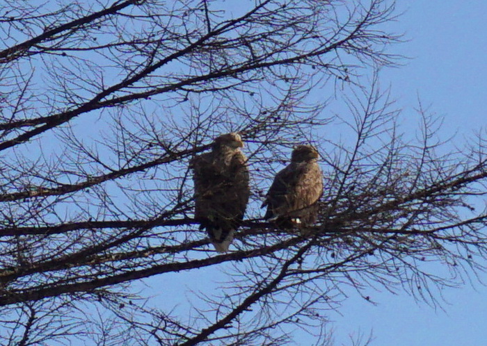 А этих орлов Настя увидела сегодня утром из окна: "Мам, кто это?" Мимо пролетала ворона, разница в размерах видна невооружённым глазом. Они действительно огромные! Когда они сидели на дереве, ветки под их весом шатались.Быстренько щёлкнули их через стекло, муж решил выйти на улицу, посмотреть, они только услышали шум открывающейся двери - тут же взмахнули крыльями и улетели.