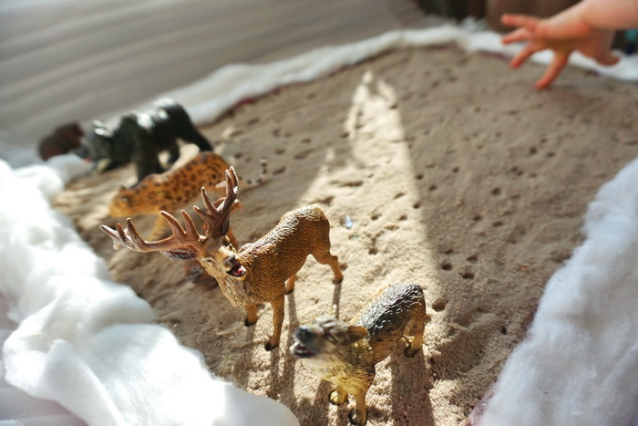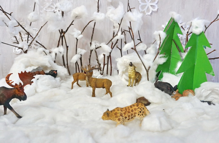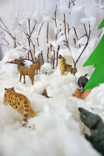 Для берлоги медведей, логова волка и нор барсука и ёжика использовала ватные снежки, которые делали в декабре.Немного разрезала и вывернула наизнанку.Ёлки тоже остались с прошлого года. Т.к. мы живём на Дальнем Востоке, то и лес у нас был тоже дальневосточный- без амурского леопарда не обошлось. Прикуплю потом и уссурийского тигра.