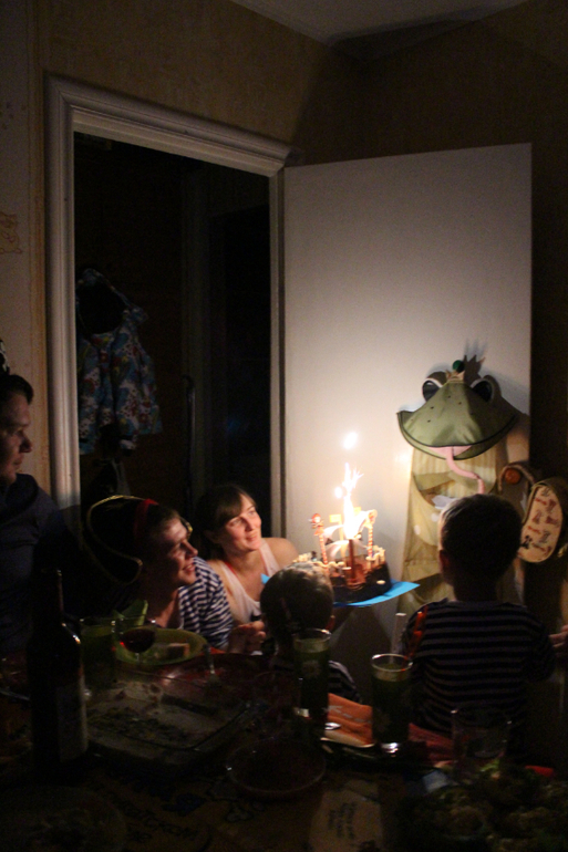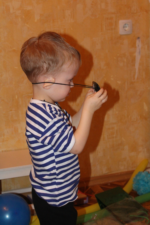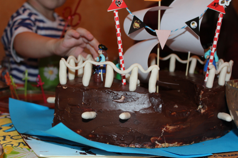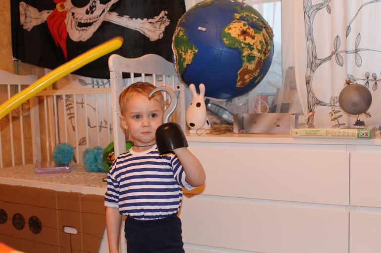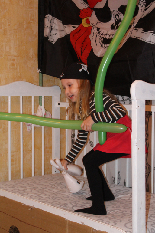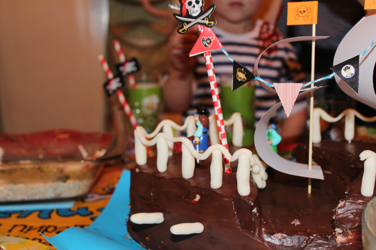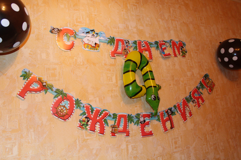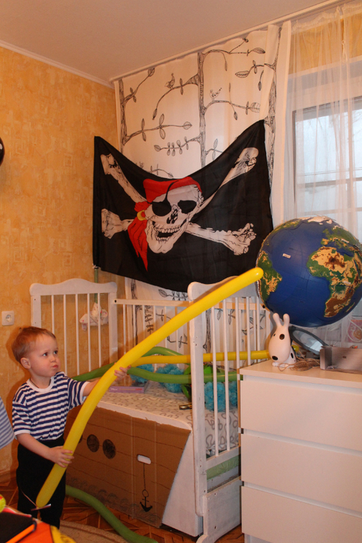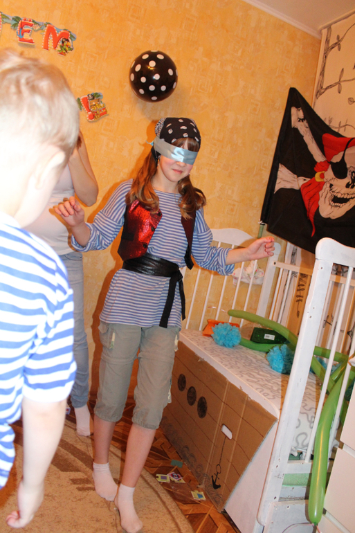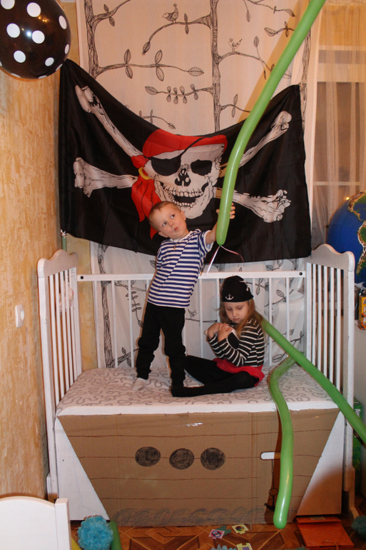Была у нас пиратская вечеринка. На 12 кв.м. собралось немало народу, но было весело. Вкусный стол, конкурсы, пиратские атрибуты, торт-корабль и конечно же салют.