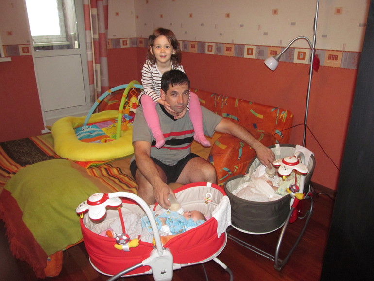 2) Потом на 4 день мы приехали домой и я столкнулась со следующей проблеммой. Детей надо куда-то класть спать. Напрашивается банальный ответ - кроватки. Ан нет, сейчас поймете. Мы еще не купили ничего тогда. Первую ночь они спали со мной и я жутко не выспалась, боялась их придавить. Еще меня смущала гигиена - все-таки это не гигиенично класть младенцев себе в постель, к тому же они могут привыкнуть и для меня это будет каторгой еще года 3 точно. Такие перспективы меня не радовали. Кроватки я не хотела, т.к. мало кто из моих подруг устоял перед соблазном уложить ночью орущего малыша к себе в кровать, а не вскакивать к кроватке при каждом писке. А тут тем более 2 малыша, я поняла, что буду прыгать как кузнечик всю ночь, а потом сдамся и переложу. Но здравая мысль победила. Я поняла, что как я сейчас заведу за правило, так и будет, и не прогадала. Купила люльки Баунсеры (можно было и обычные люльки, которые можно опустить вровень с высотой дивана) и поставила их возле дивана, на котором я сплю. Таким образом я смогла одновременно укачивать сразу двоих (а это МЕГА важно когда плачут оба) и не вставать стоя, а либо сидеть либо если ребенок еще не сильно раскричался, то прям лежа сунуть соску и рукой подкачать. Первые 7 месяцев дети спали в этих баунсерах. я их очень советую! Берите бу, я взяла бу и не жалею. Вот фото когда малышам 1 месяц и муж их кормит: