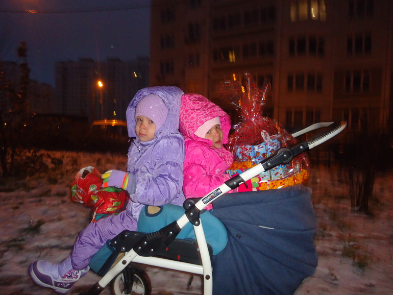 Я своих лошадок до сих пор вожу в сад и в поликлинику двоих на одиночной коляске. Летом подруга переезжала в другой город и мне свою коляску оставила. Я ее сначала хотела отдать, а потом мы стали в поликлинику на массаж ходить, а поликлиника у нас далеко 35-40 мин. пешком иду, и мне пришла в голову мысля усадить обеих в одну коляску. И так я обрадовалась, что не отдала ее никому. Угробили мы коляску, конечно. Сломали спинку, она теперь в поднятом состоянии не держится и ногами сильно испачкали.