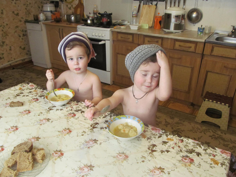 Когда кушают, я им и кофты и футболки снимаю. А то заляпают всё! Без этого никак
