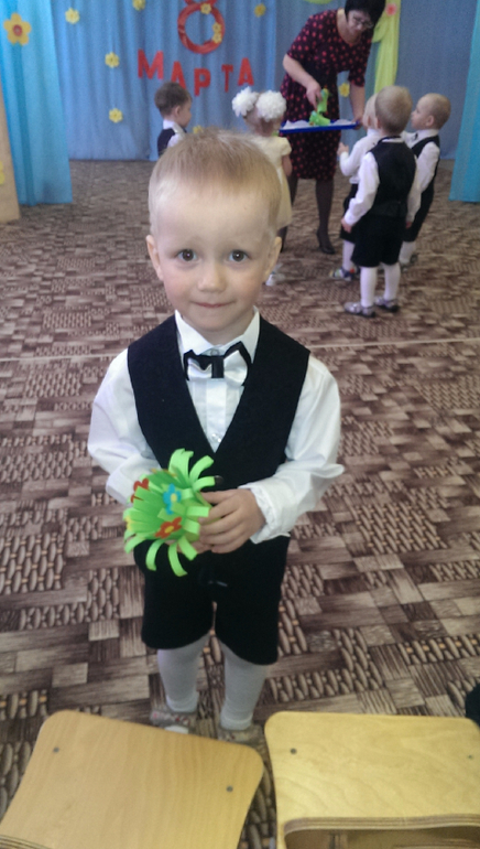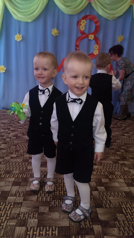 На 8 марта ходили на наш первый утренник в сад, сообщили мне о нем в 4 вечера когда я их забирала, что типа он в 9 утра завтра и надо что нить белое наверх, рубашечки футболочки. Ага конечно, у меня прям куча белого для пацанов припасена, прям из шкафов все вываливается белое то... вобщем я как ненормальная понеслась в ближайший кораблик (час езды на машине от нас) пока он не закрылся. Как же так, наш первый утренник а мы не при параде, не порядок, я не могла этого допустить иииииии .... вуаля))