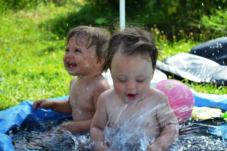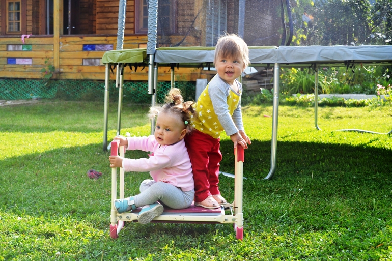 Пруд придется или огородить. или убрать. Уследить не всегда будет возможность за одним ребенком -то, а у вас двое. Убрать всякие бочки для полива, куда могут тоже влезть. Глубокие колодцы закрыть . чтоб не открыли. Батут - высота - просто учите их слезать сначала на табуретку или стул. Вообщем подставьте им что-то высокое , чтоб могли залезать сами и слезать ( у нас такой же батут) . Да и уличный туалет на щеколду. А то и туда могут залезть
