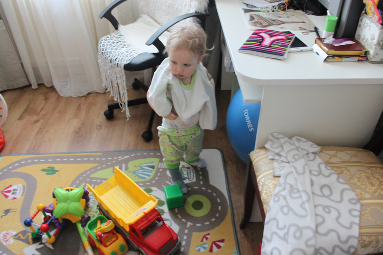 Научились надевать штанишки, с кофтами пока хуже, только голову могут засунуть. Катя напяливает сандалики и даже делает попытки (иногда успешные) застёгивать ремешки на них. Приносят и подают вещи -- маме мамины, а папе папины.