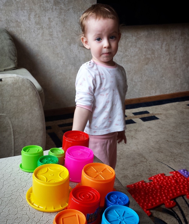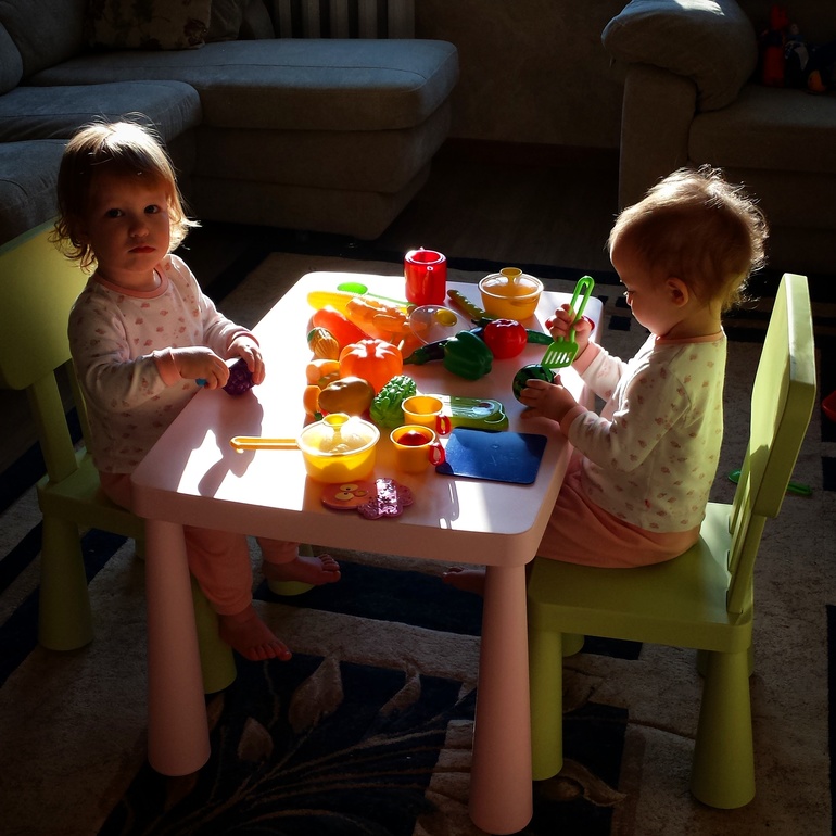 Связываем уже два, три слова. Мама пока пока, иди май (уйди мое) и подобное. Много жестов (парой ооочень много, особенно у Поли). Ната больше болтает и у нее меньше жестов, но если хандра, то Ната включает сирену на пол дня и тушите свет. Поля говорит Тата и все время за нее переживает, если дали Поле, то она хлопочет и кричит Тата Тата и показывает на предмет, который ей дали. И так во всем. Понимаем ВСЕ! Даже не буду перечислять. Знают больше 300 слов, я думаю. От предметов, вещей, до животных и действий. Любят ванну. Долго там плюхаются. Играют в куклы, посудка их любимая часть игры. Накупила им овощей, фруктов и пирожных из пластика и резины... теперь вечерами у нас чаепитие с резиновыми кексами))). Собираем конструктор. В общем в моторике и играх пробоем, ттт нет.