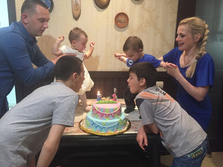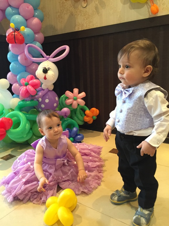 . Очень любит топать на улице ножками и совсем не любит сидеть в коляске. Ну а теперь не много о нашем празднике! Дети проснулись в прекрасном настроении и такое было чувство что они понимали что это их день! весь день пока мама готовила на стол и занималась украшением дома детки провели с бабушками, за что им огромное спасибо и низкий поклон!!!! Вечером детки нарядившись в свои наряды которые мама приготовила еще четыре месяца назад встречали гостей принимали поздравления и наслаждались вниманием, вели себя замечательно и спать улеглись по расписанию позволив и маме тоже отдохнуть и выпить бокал шампанского!!! жаль что к празднику готовишься так долго, а пролетает он быстро, так же как и первый год такой волнительный в начале своего пути и полный неожиданных открытий. ну а дальше немного фото виновников торжества и самого пиршества!!!