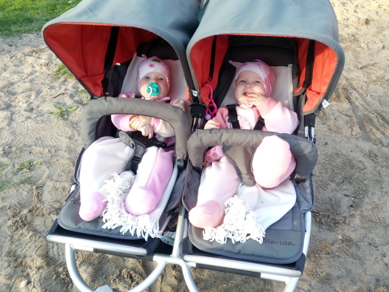 Наши прогулки: гуляем долго. И спим и бодрствуем во время прогулок. Все становится им интересно, за всем наблюдают, очень реагируют на звуки, прям готовы выпрыгнуть из коляски, чтобы посмотреть что загудело, засвистело )))