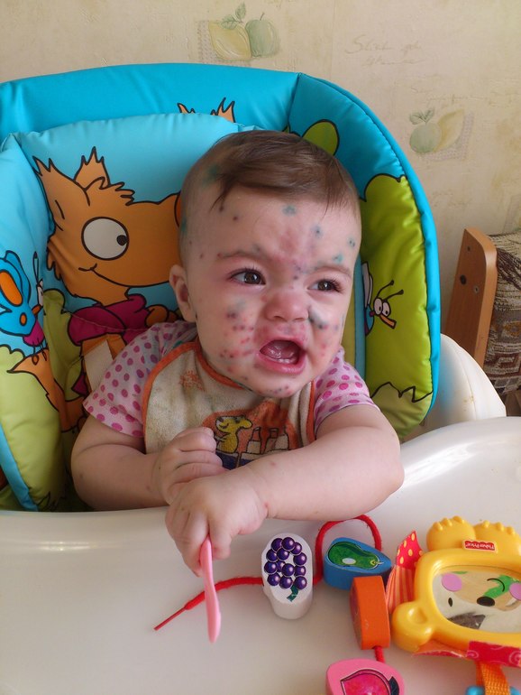 У доктора Комаровского очень хорошее объяснение зачем мазать ребёнка зеленкой - незачем. Это исключительно советская придумка и нужна только для выявления новых высыпаний. То есть если утром не нашли новых прыщиков, значит болезнь пошла на убыль.