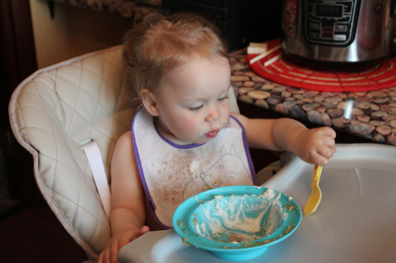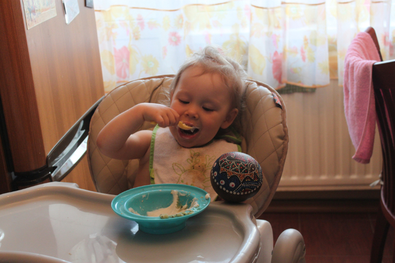 Очень славно орудуют приборами. Правда, гречу и невкусное могут выплюнуть пережеванным:/ Раньше такого не наблюдалось.