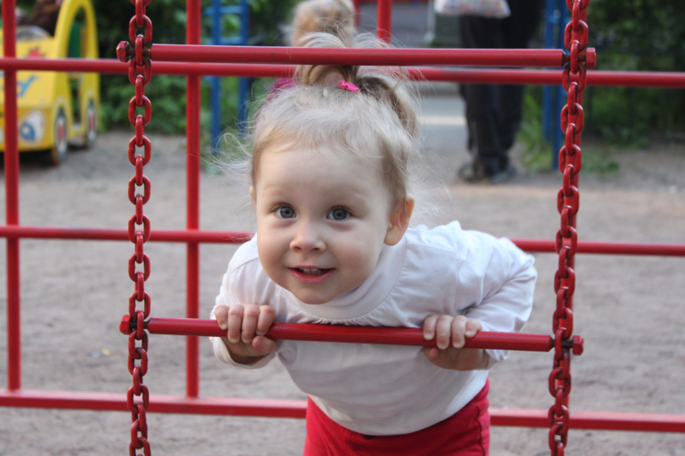 Научились забираться на перекладины типа шведской стенки. Лезут к облакам быстро и упрямо. Сие зрелище спокойно переносить не могу--обламываю кайф, возвращая с небес на землю.