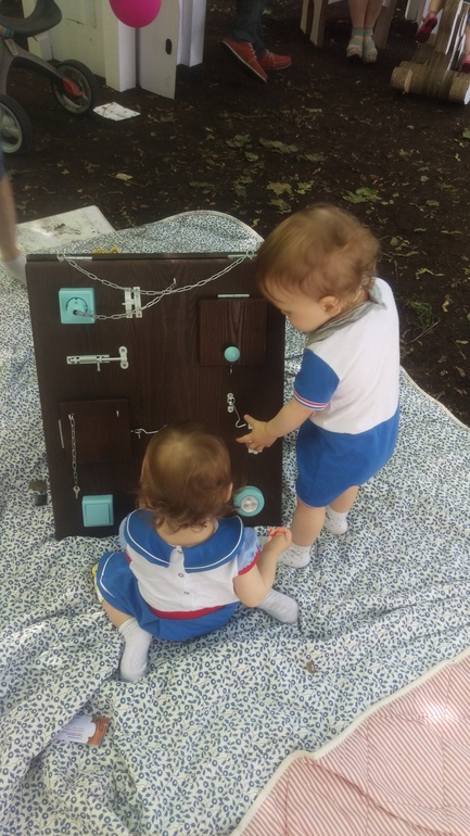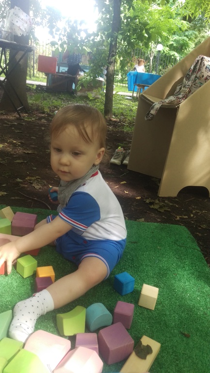 Вместе с детьми и для детейЕздили сегодня с детьми в Сокольники погулять. Не самый удобный возраст сейчас. Везде им надо, в коляске не сидят долго. А спокойно выпустить негде. Набрели на детскую территорию ("пупсозона", Как я это называю), на покрывалах разложены деревянный конструктор, бизиборд, картонные домики, попрыгун резиновый. По покрывалам босиком, а вокруг земля черная-надо контролировать, чтоб не ушли. всё-равно неплохо дети там потусили.