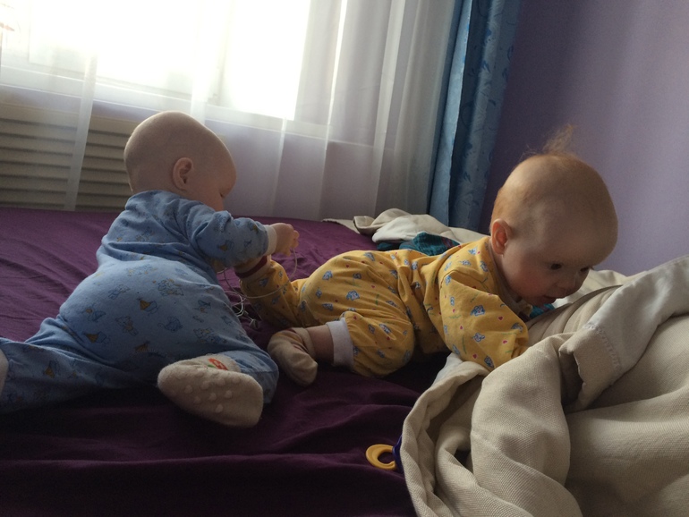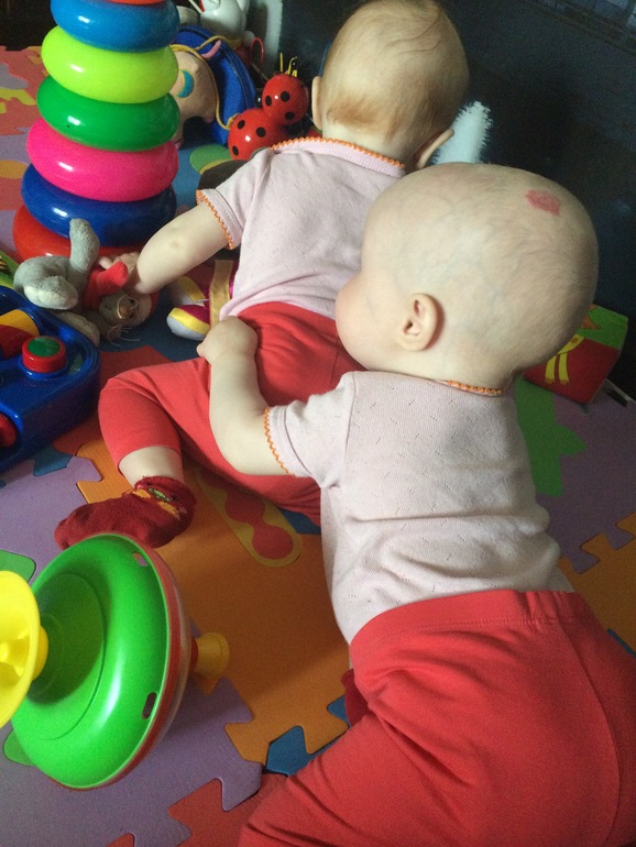 Перестали играть одни. Нужно чтобы я обязательно была в поле зрения. Иначе начинается ор до истерики. Яна вообще щас может приползти и залезть на руки. Поэтому сижу с ними на полу, подсовываю игрушки, книжки.