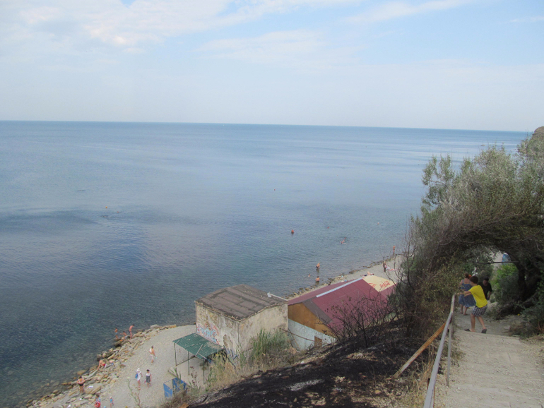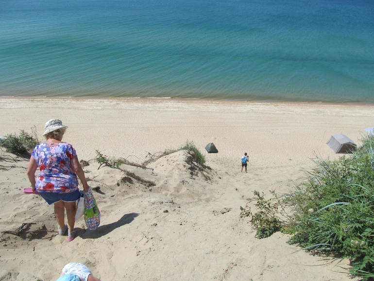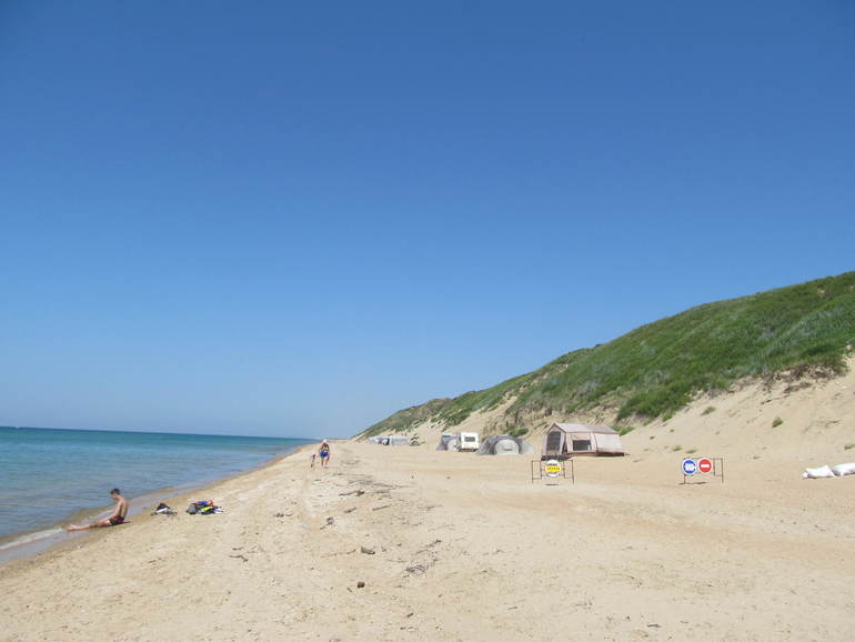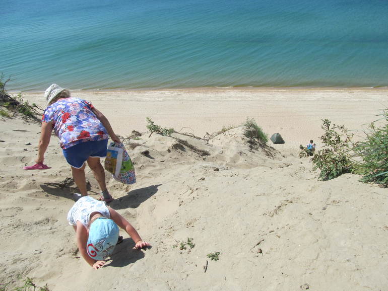 На оратном пути уже фоток не было. Так как солнце уже хорошо припекало, ыло не до фоток..Плюс раскалённый песок. Подъём был тяжеловат. Муж сначала поднялся наверх, отнёс сумки. Потом спутился помог бабеньке (она застряла на полпути в гору, а песок ооочень горячий). Детки плакали, очень устали. Чтобы укрыться от палящего солнца, пришлось идти в палатку к нудистам
