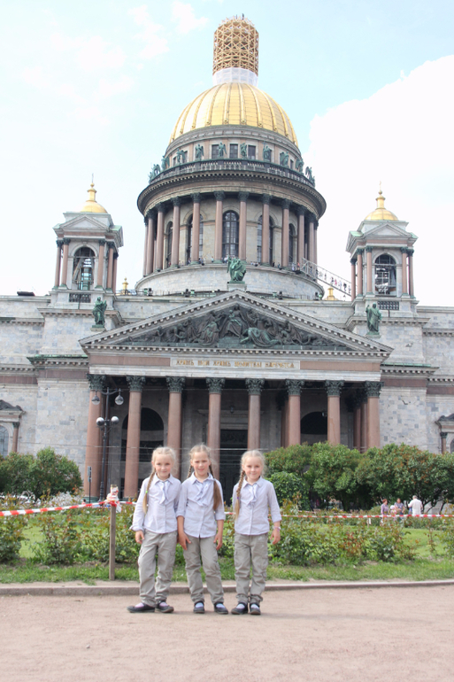 В 11.00 разместившись в съёмной квартире и быстро перекусив, отправились на экскурсию в Исаакиевский собор на колоннаду. 262 ступеньки мелкие преодолели быстро, Санька немного боялась. Долго не могли выучить название «Зазакиевский забор»