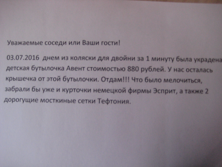 Мамочкины посиделки. О нас,наших диетах, достижениях, переживаниях...Вчера днем пришли мы с прогулки. Папа понес детей домой, а я закатила коляску на 1 этаж, взяла суму с продуктами и подняла ее домой. Сразу же спустилась за коляской. Не было меня всего около минуты. За это время кто то стащил из коляски бутылочку Авент. То, что мы ее не потеряли по дороге-100%, т.к. перед входом в подъезд я выливала из нее оставшуюся воду и положила в нижнюю корзину уже на 1 этаже. Подъезд закрытый, домофон.