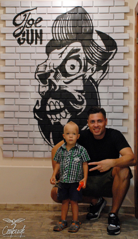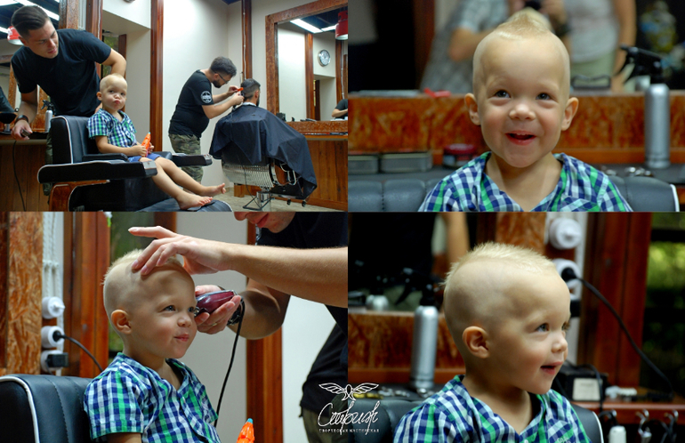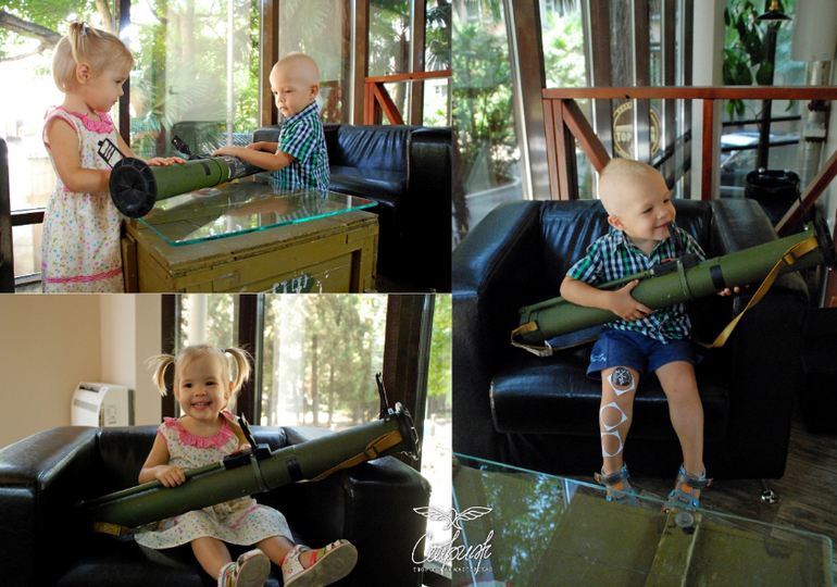 Салон действительно крутой. Муж с ними сотрудничает, вот и пошли туда стричься. А салон чисто мужской, поэтому Соня пока только наблюдала. И да, гранатометом тоже поиграла 😃