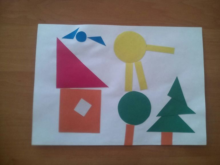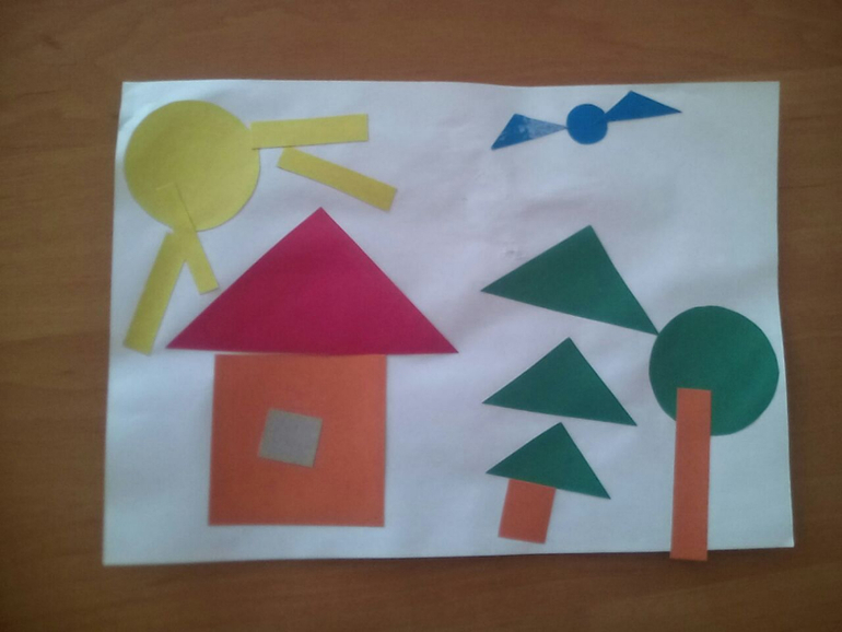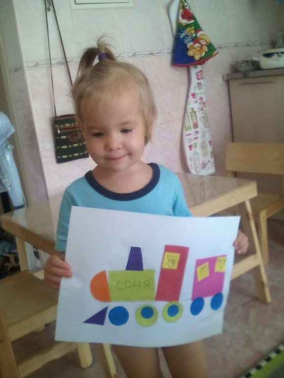 Впервые мы попробовали аппликации из цветной бумаги. Самую первую аппликацию клеили на чистом белом листе бумаги - было трудновато объяснить им, какую фигурку куда пристроить, и они на удивление справились хорошо. Затем стала карандашом рисовать им рисунок, а они уже сами подбирают заготовленные цветные фигурки и наклеивают - и отлично справляются! Сами клеем мажут, сами на листок пристраивают - всё сами.