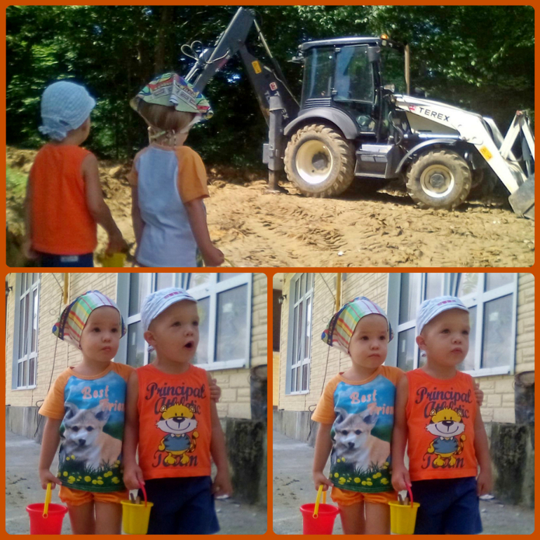 Оба фанатеют от спецтехники: бетономешалки, КАМАЗы, бензовозы, тракторы и прочее. Дима фанатеет эмоциональнее, Соне тоже нравятся, но она менее эмоциональна у нас. Возле остановки у нас "паркуется" несколько экскаваторов. Иногда ходим гулять до туда. Подходим, осматриваем, пинаем колеса (это они любят, потому что папа на нашей машине тоже колеса пинает - значит, так надо). Все водители нас уже знают, за руку с Димой здороваются. А на днях один водитель завел трактор и посадил Димку вовнутрь, дал ему на сигнал нажать, руль покрутить. Дима немного испугался тарахтения и вибрации, но остался доволен. А однажды мы вышли гулять, а возле соседнего дома экскаватор площадку разравнивал и отсыпал. В общем, полчаса мы точно за ним наблюдали. Потом силой их оттуда увела. Соня побаивалась, когда экскаватор двигался в их сторону, и от страха приобнимала Диму :)