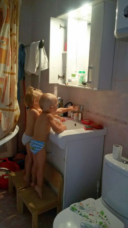 Вечерний туалет - сами приносят стульчики, снимают маечки и сами чистят зубы. Пасту уже не глотают, как раньше, а сплевывают (это же так увлекательно!), и рот полощут - воду не глотают: